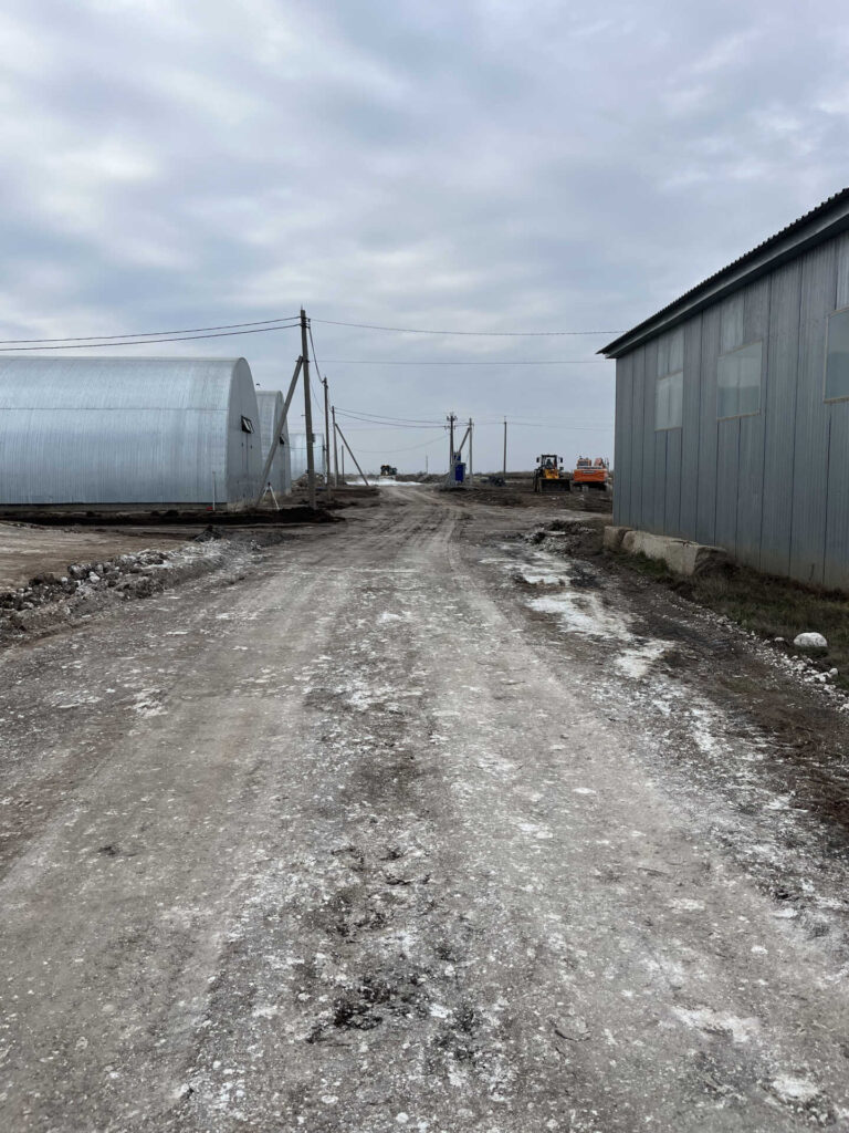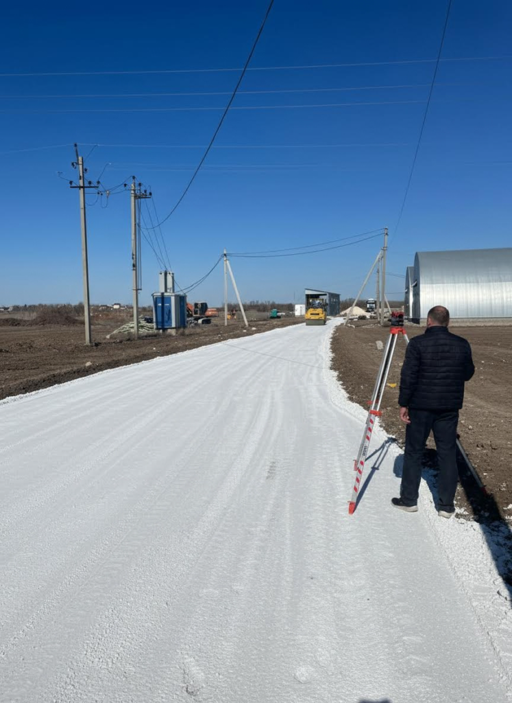 На объекте АО «Азимут» выполнена укладка техногипса без финишного асфальтового покрытия. Была проведена геодезическая съемка территории, очистка от растительности и мусора, выемка верхнего слоя грунта на глубину 30 см. После чего уложили, выровняли и утрамбовали техногипс. Заказчик получил подъездные пути к зернохранилищам и основание под ангарами за 63% от стоимости проекта с использованием традиционной технологии.